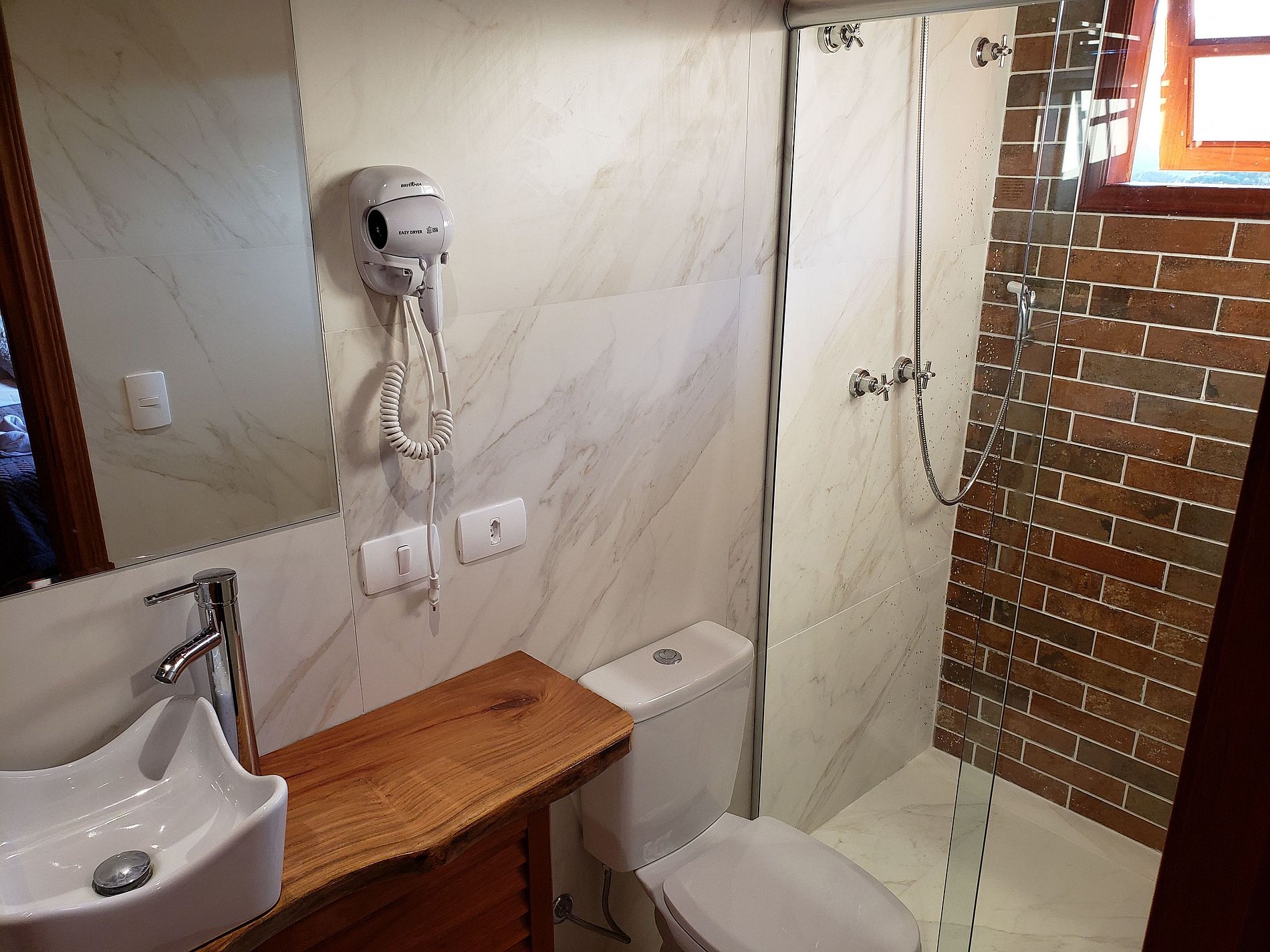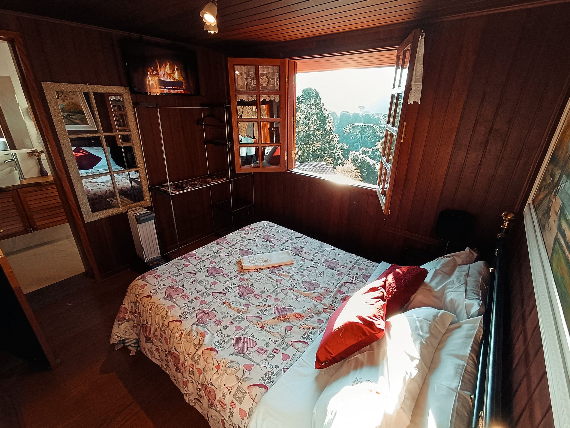Com uma privilegiada e linda vista da montanha , a suíte é toda em madeira, dando um ar de cabana rupestre, com uma cama de casal super confortável. Você tem a liberdade de entrar e sair a qualquer momento do dia ou da noite, pois terá a cópia da chave do quarto, da casa e o controle do portão. Caso esteja trazendo um ou mais pets, é cobrada uma taxa adicional para cada um dos nossos hóspedes de quatro patas.