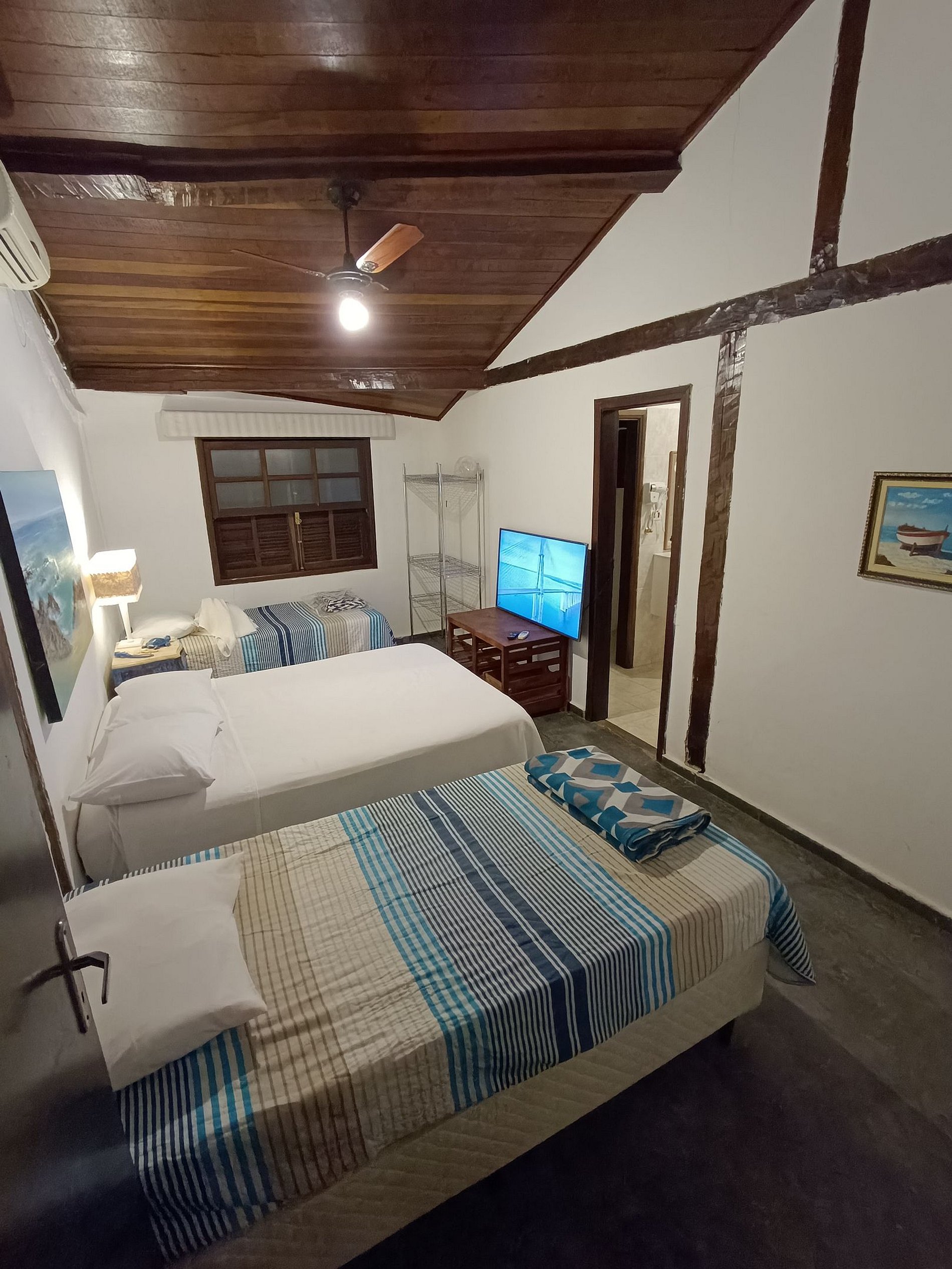 No interno 3 suítes com ar condicionado, ventiladores de teto, camas confortáveis e Smart TV de 50 polegadas em todas as suítes.