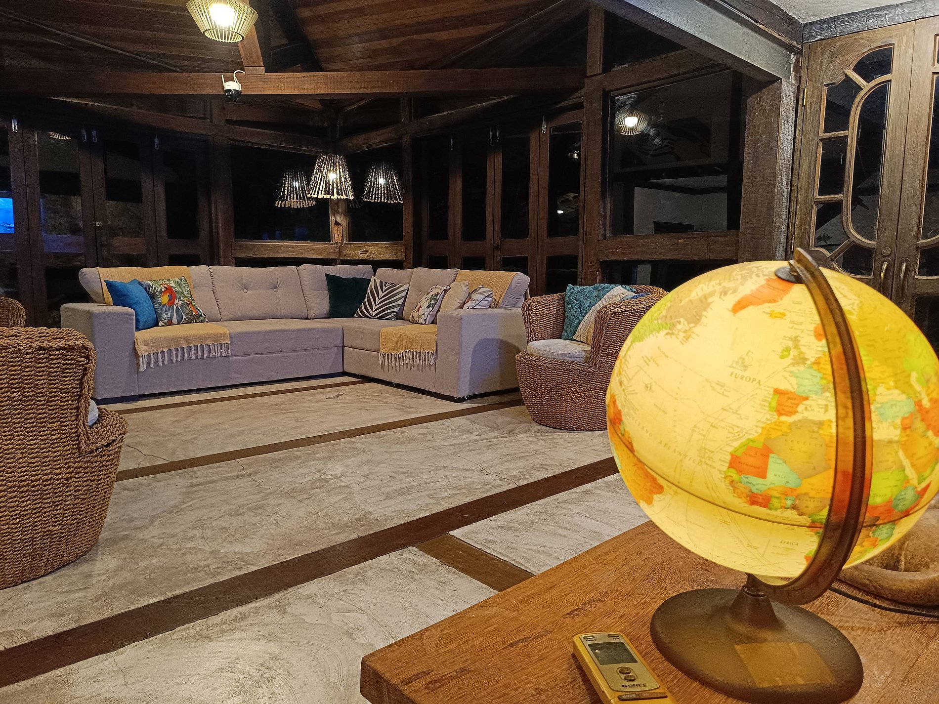 Casa Rústica toda em estrutura de Madeira de Lei, projetada pelo Arquiteto Fábio Melo, faz fundos para a reserva da Mata Atlântica, proporcionando uma experiência de contato com a natureza, com muito conforto e sustentabilidade.
