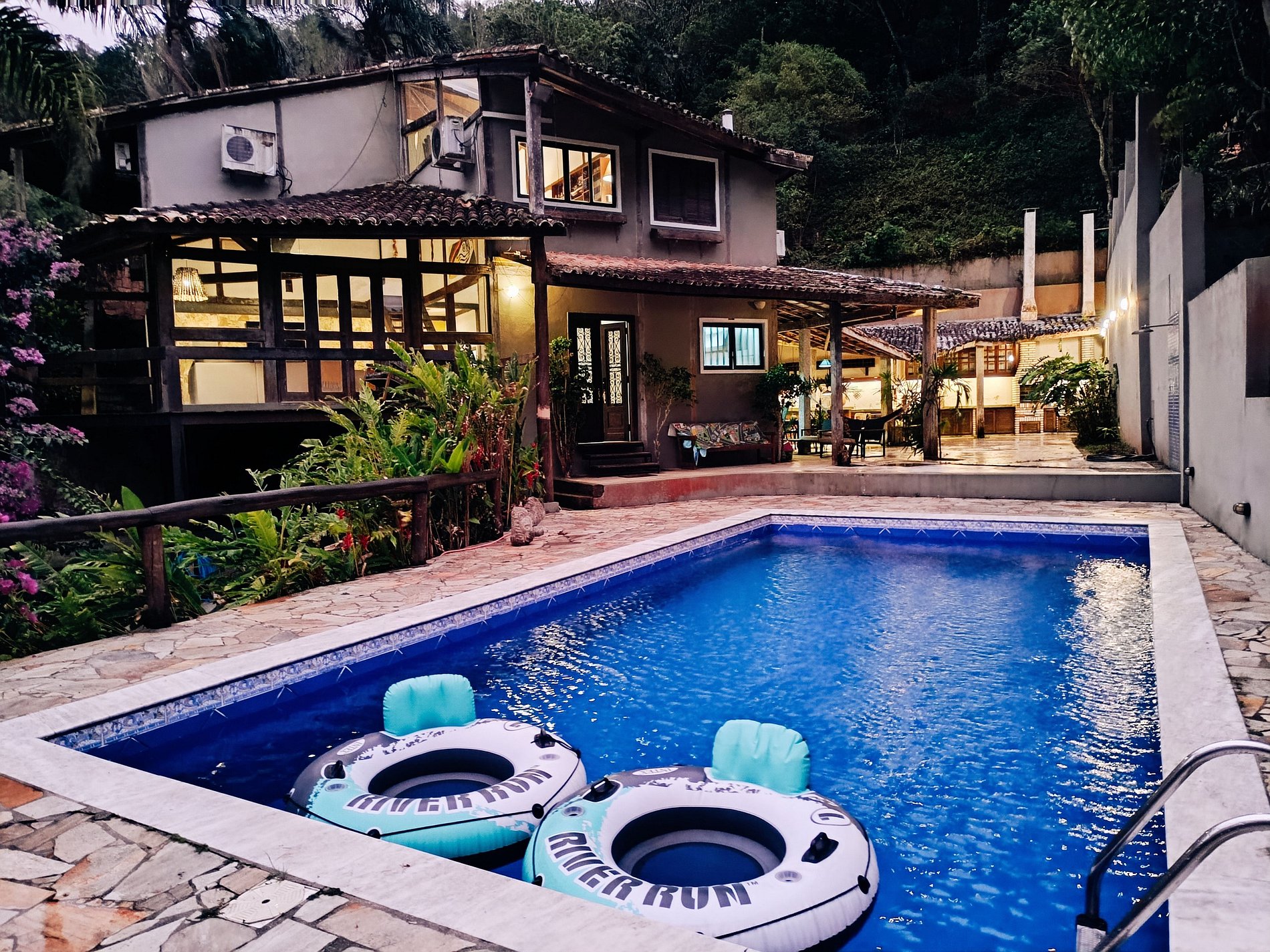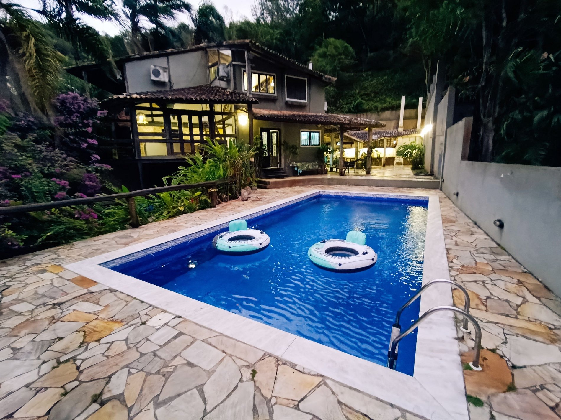 Casa Rústica toda em estrutura de Madeira de Lei, projetada pelo Arquiteto Fábio Melo, faz fundos para a reserva da Mata Atlântica, proporcionando uma experiência de contato com a natureza, com muito conforto e sustentabilidade.