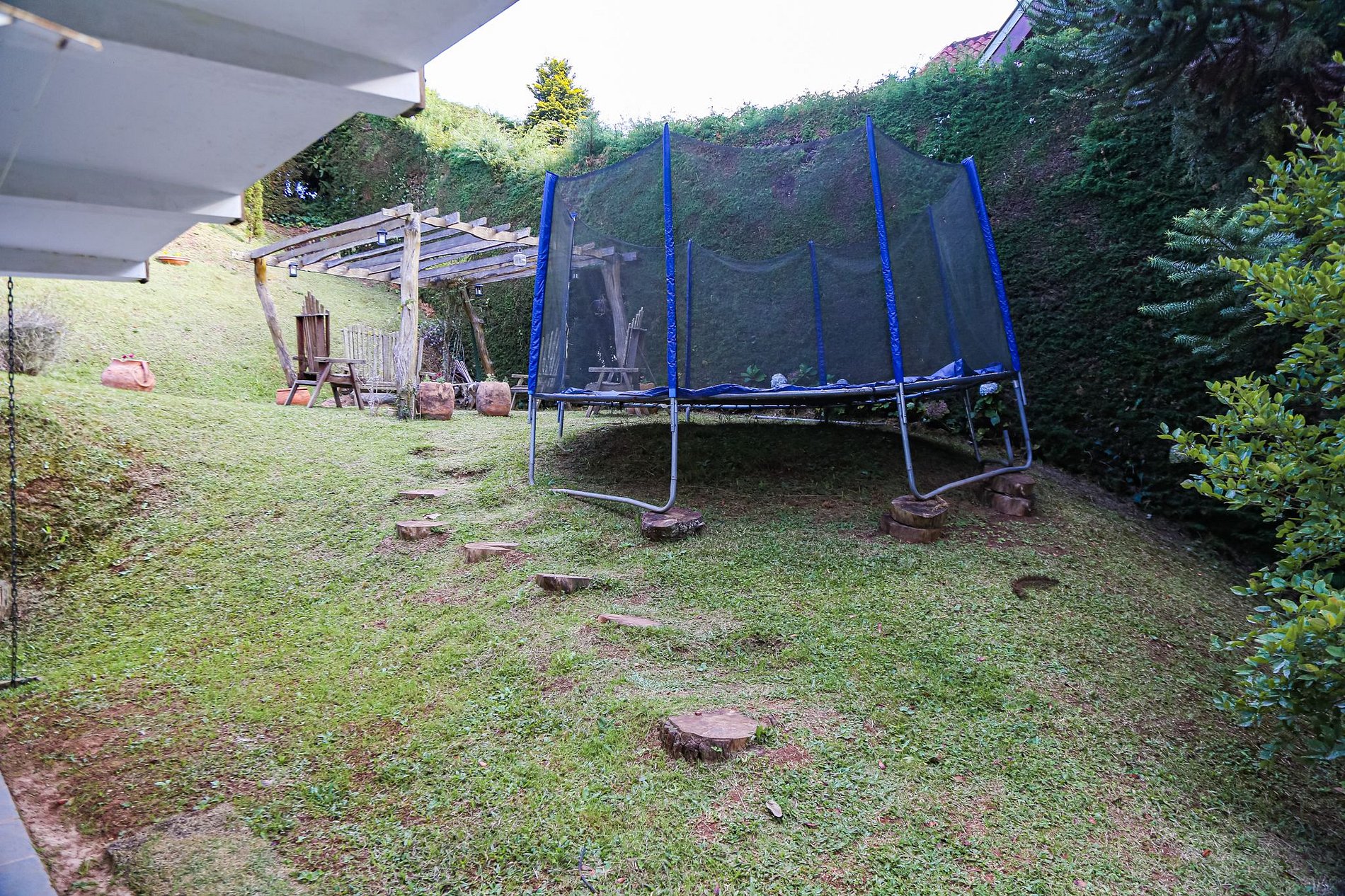 Piscina, quintal, cama elástica e estacionamento são espaços compartilhados com outros hóspedes do complexo.