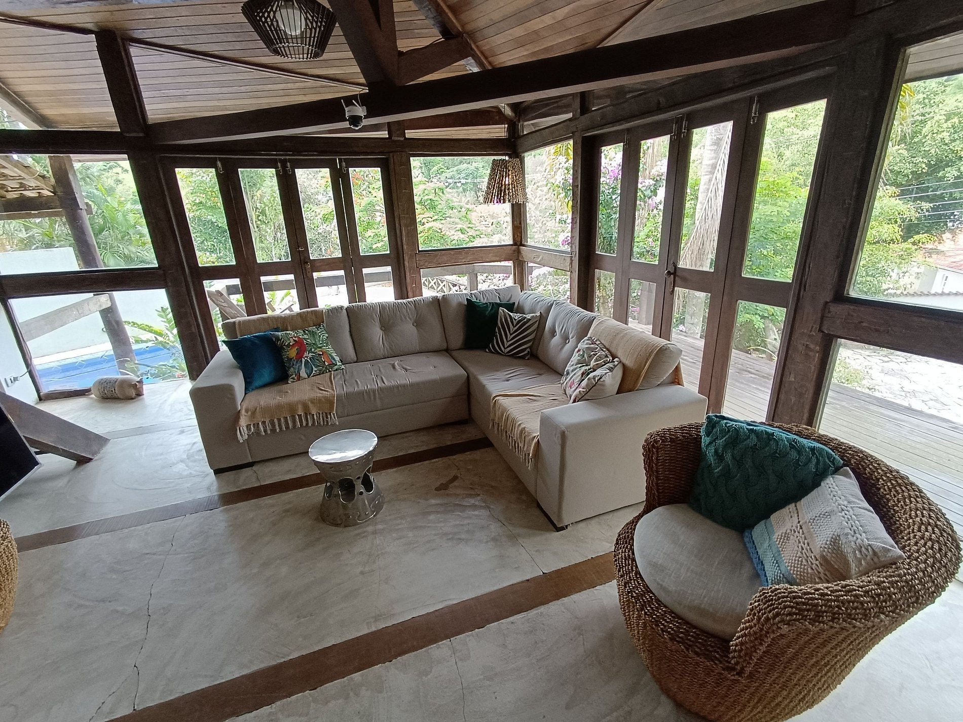 Casa Rústica toda em estrutura de Madeira de Lei, projetada pelo Arquiteto Fábio Melo, faz fundos para a reserva da Mata Atlântica, proporcionando uma experiência de contato com a natureza, com muito conforto e sustentabilidade.