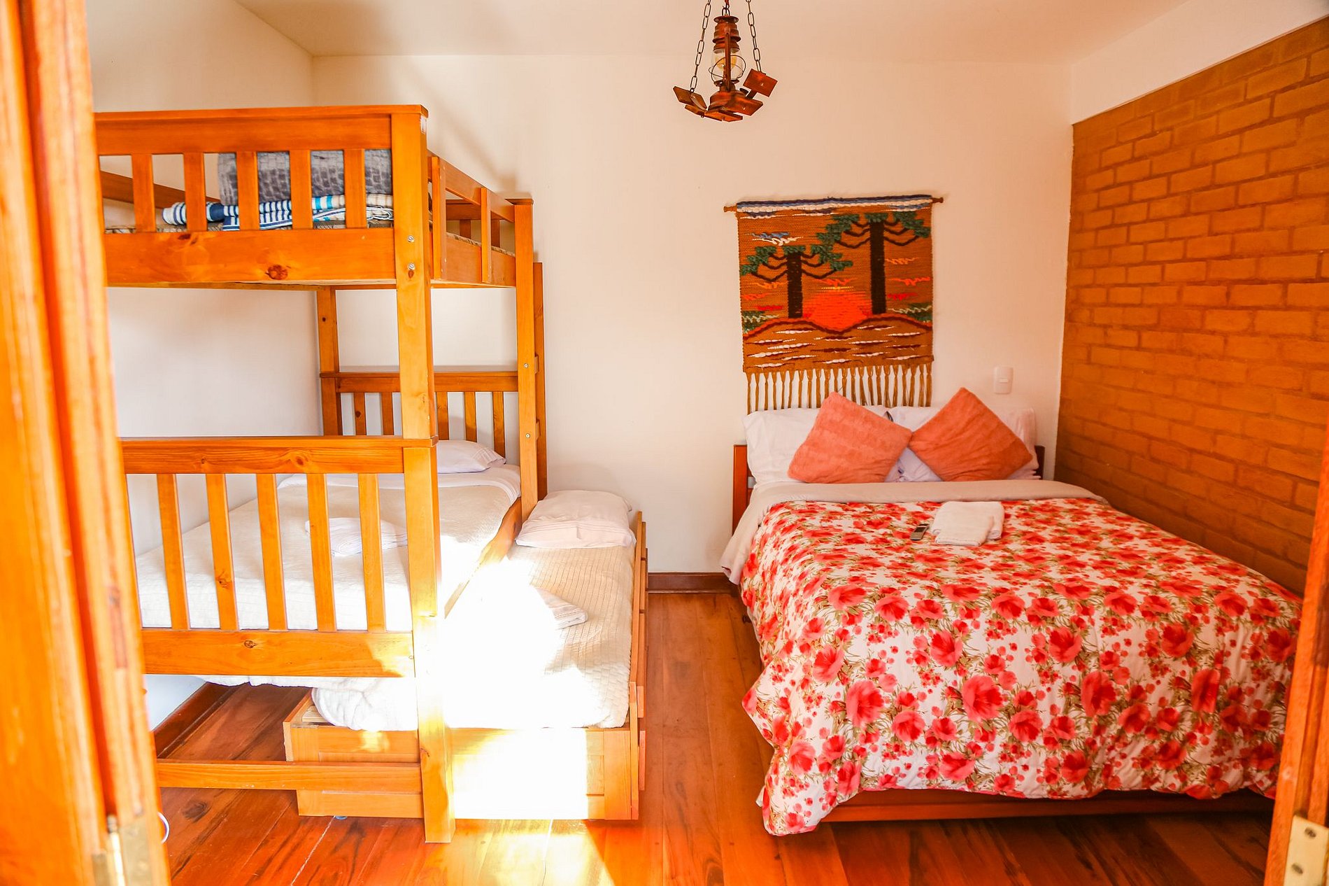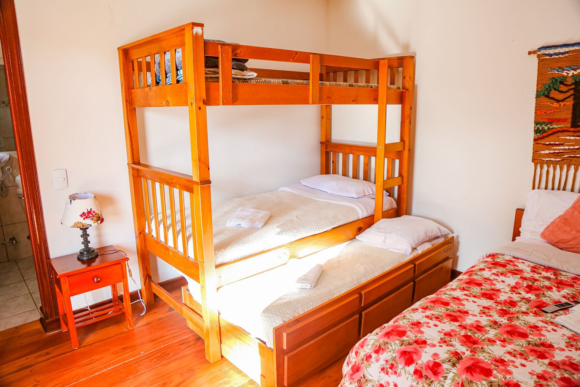 Com uma vista privilegiada para as montanhas e de fácil acesso a piscina, a suíte possui uma maravilhosa cama de casal, uma beliche e uma cama auxiliar de solteiro, perfeita para acomodar a família. O banheiro é privativo e conta com chuveiro a gás. Você tem a liberdade de entrar e sair a qualquer momento do dia ou da noite, pois terá a cópia da chave do quarto, da casa e o controle do portão. Caso esteja trazendo um ou mais pets, é cobrada uma taxa adicional para cada um dos nossos hóspedes de quatro patas.